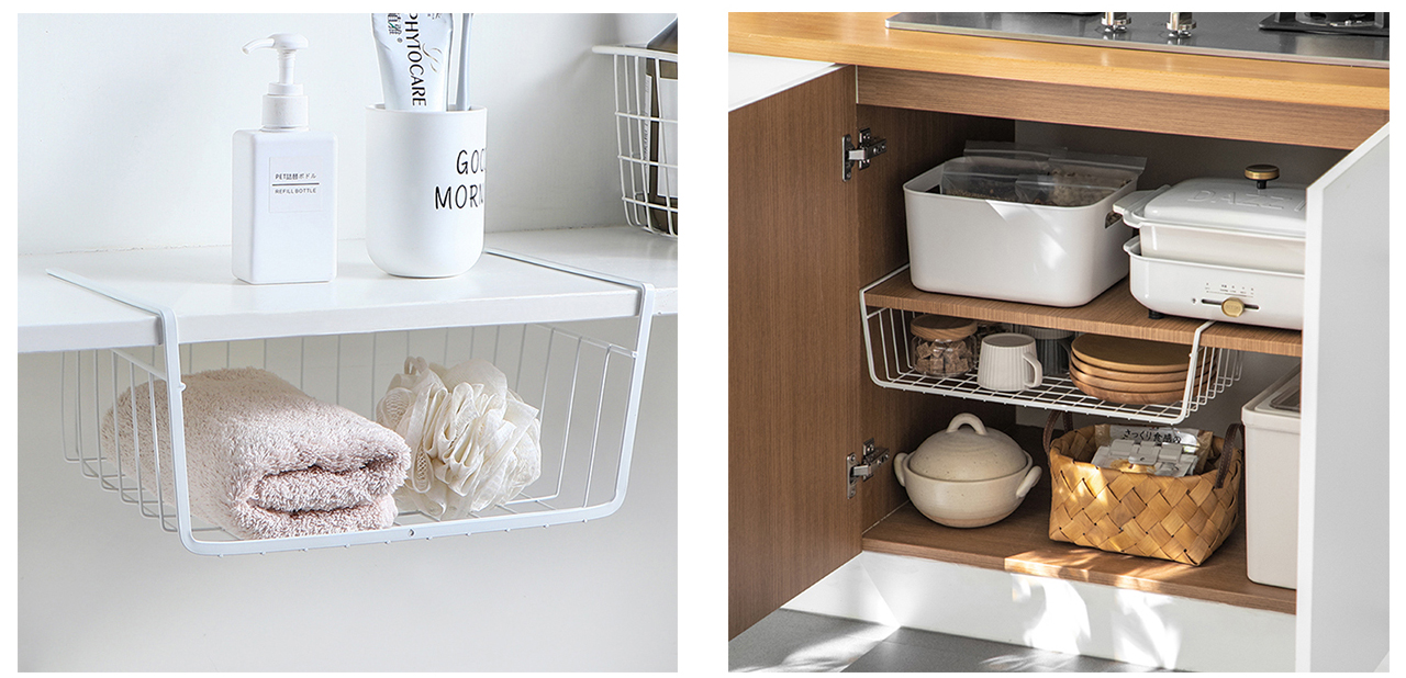 Maximice el espacio de su gabinete instalando cestas de alambre debajo. Esta solución innovadora facilita el acceso a ollas, sartenes y tapas sin la molestia de apilar y desapilar.